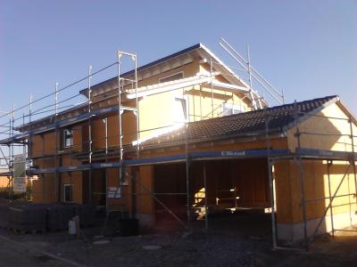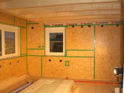 Unter großer Mithilfe von Bruder, Schwager + Schwager sowie Schwiegervater sind wir seit gestern abend nahezu fertig mit der OSB-Beplankung. Nachdem der Heizungsbauer entgegen der Aussage des Bauleiters doch noch in die Wände musste, wurden bereits angebrachte Platten wieder abgeschraubt - da kommt Freude auf. Also Merke: Erst bei den Handwerkern nachfragen, dann den Auftrag für die Beplankung erteilen :-)!