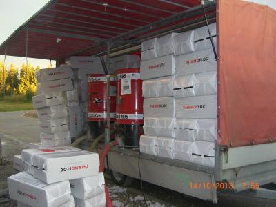 ging es los, mit 2 "Zellofanten" und ca. 300 Säcken Zellulose a 14kg dämmten wir unsere 30 cm starken Holzständer in 1,5 Tagen. Unsere Aufgabe war es, die "Zellofanten" mit Zellulose zu füttern, damit die Zimmermänner immer genug Material zum Einblasen hatten. Die Staubmasken waren nicht umsonst, eine ziemlich staubige Angelegenheit. Im Grunde genommen ist die Zellulose nichts anderes als ganz ganz feine Papierschnipsel, welche mit Borsalzen angereichert sind, um es zu einem schwer entflammbaren Dämmstoff zu machen.