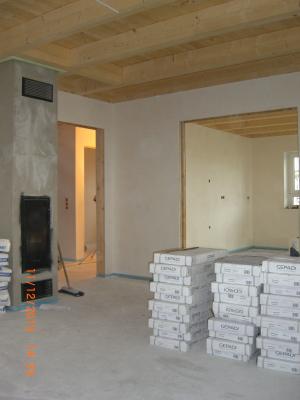 Eigentlich hätte ich schon früher schreiben können: Nachdem wir unseren Technikraum mit einer Fläche von ca. 4qm selbst verspachtelt haben, mussten wir feststellen, dass ein ganzes Haus zu verspachteln doch zuviel ist: Also organisierten wir einen Spachteltrupp, welcher in gut 8 Tagen das komplette Haus verspachtelt haben. Und dass mit einer richtig guten Qualität! Und zudem viel viel günstiger als über die Zimmerei, welche das Haus gestellt haben!